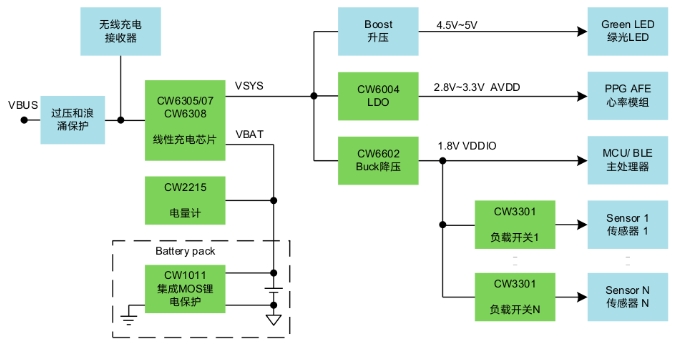 隨著技術的飛速發展,智能指環作為新興智能可穿戴設備越來越被品牌廠商所關注。中國穿戴廠商華米在CES 2024期間發布了名為Helio Ring的智能指環新品;韓國三星電子于2024年7月正式發售指環產品Galaxy Ring,市場反響熱烈。智能指環既有裝飾潮品的時尚屬性,又是智能手機的輔助智能感知配件,用于人體健康數據的監測。相比手表和手環,指環更貼合皮膚,因此在收集人體基礎生物信息,如脈搏、心率、血氧、心電圖,以及監測體溫等方面更有精準度優勢。指環相比智能手表,還有無感佩戴的特點,更能滿足用戶的差異化需求。智能指環受限于空間尺寸,配備的鋰電池容量通常在15~23mAh,而續航時間則需要達到5天或更久。因此,超低功耗且超小尺寸的芯片必為產品開發者所青睞。賽微微電(CellWise)已經量產多款超低功耗的小尺寸電源芯片,如Figure1所示,都非常適用于智能指環應用。Figure 1.智能指環電源方案線性充電器-CW6308、CW6305/6307CW6308是一款支持I2C接口和電源路徑管理的線性充電芯片,尺寸為業內最小,充電電流最大支持320mA。在僅有電池供電并開啟Watchdog功能后,芯片工作電流仍低至5μA。CW6308還支持500nA超低功耗模式和300nA船運模式,封裝為WLCSP-9,尺寸為1.24mm*1.24mm。CW6305/6307功能與CW6308一致,區別是可支持最大470mA充電電流,芯片封裝尺寸為WLCSP-9,1.55mm*1.55mm。電量計-CW2215單節鋰電池電量計CW2215的工作電流僅為5μA,是業內最低,內置高精度ADC,支持電壓、電流和溫度監測。芯片內置“FastCali”算法,結合對客戶電池樣品建模測試提取的電池特征參數,可完成對電池剩余電量(SOC)、循環數(Cycle)和電池健康(SOH)的精確計算,并可配置對低電量、高溫或低溫的情況進行中斷上報。CW2215為WLCSP-9封裝,尺寸為1.58mm*1.53mm。LDO低壓差穩壓器-CW6004CW6004是一款超低功耗LDO,靜態工作電流低至300nA。其輸入電壓1.6V~5.5V,輸出電壓有1.1V, 1.2V, 1.5V, 1.8V, 2.5V, 2.8V, 3.0V和3.3V可選,輸出電流為200mA。CW6004具有快速的動態響應特性,當設備從Standby輕載快速切換到Active重載的工作場景下,VOUT輸出電壓也能保持穩定。該芯片為DFN-4封裝,尺寸為1.0mm*1.0mm。Figure 2.  CW6004靜態電流vs輸入電壓Figure 3.  CW6004 Ground電流vs 輸出電流Buck降壓轉換器-CW6602、CW6603CW6602是一款超低功耗Buck降壓轉換器,輸入電壓為2.15V~5.5V,輸出電壓為1.2V~3.3V共8檔可選。其靜態工作電流低至330nA,負載電流能力為0.6A/峰值電流1.0A。在1.8V輸出電壓時,芯片的重載效率達90%以上,100uA輕載的效率也可達85%。該芯片具有快速的負載動態響應能力,封裝為WLCSP-8,尺寸為1.575mm*0.825mm。CW6603的功能和尺寸與CW6602一致,區別是輸出電壓范圍為0.6V~1.2V。Figure 4.CW6602 Vout=1.8V的轉換效率負載開關-CW3301CW3301是一款超低MOS導通電阻的負載開關,輸入電壓為1.1V~5.5V,最大通流能力2.0A。芯片的輸出電壓擺率(slew-rate)受控,有效保護后級芯片;CW3301具有業內領先的5nA On-State靜態工作電流和12nA Off-state漏電流,并支持輸出快速放電可選;其封裝為WLCSP-4,尺寸為0.76mm*0.76mm。鋰電保護-CW1011CW1011為單節鋰電池保護芯片,支持高精度過壓、欠壓、充電過流、放電過流和短路保護。芯片內部集成了54mΩ導通電阻的Dual MOSFETs;其靜態工作電流為2.5μA,并支持休眠模式,功耗低至20nA。CW1011的封裝為DFN-6,尺寸為2.0mm*1.5mm。賽微微電(CellWise)深耕超低功耗電源技術多年,在智能手表、TWS耳機、主動手寫筆、無線藍牙鍵鼠等可穿戴設備和數碼配件上擁有眾多design wins。今天介紹的這些電源芯片,一定也可以助力各品牌廠商和方案開發者,實現智能指環的更小空間堆疊、更長電池續航和更優用戶體驗。感謝大家對賽微微電公司和產品的持續關注。